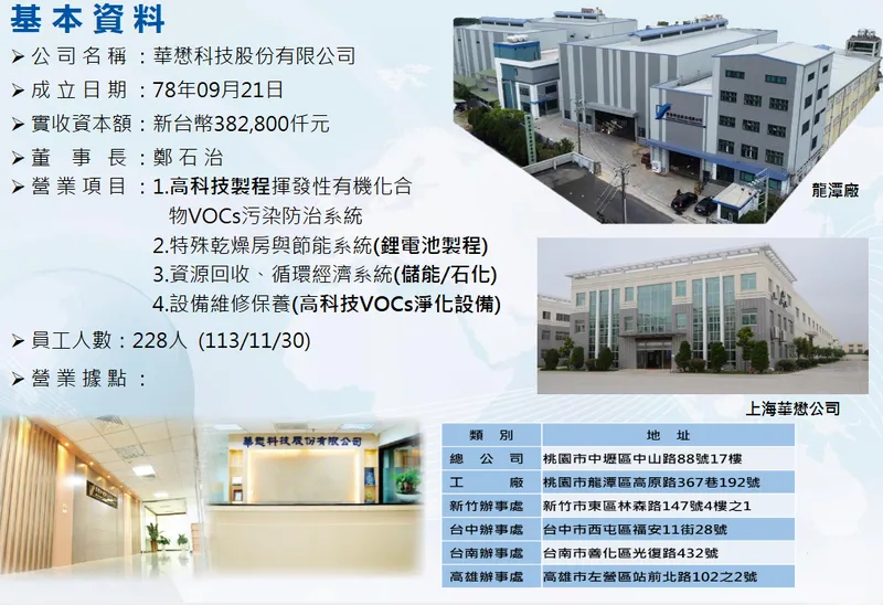 成立初期專注於除濕技術,隨後切入 VOCs 防治領域。1996 年成功導入「沸石轉輪濃縮+焚化系統」,打破外商壟斷,成為台灣首家打入半導體供應鏈的本土環保設備商。